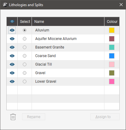Once you have created the split lithology column as described in Creating a Split Lithology Column, the next step is to select the base column lithology that will be split. In this example, we will create splits for a base column lithology called Alluvium: