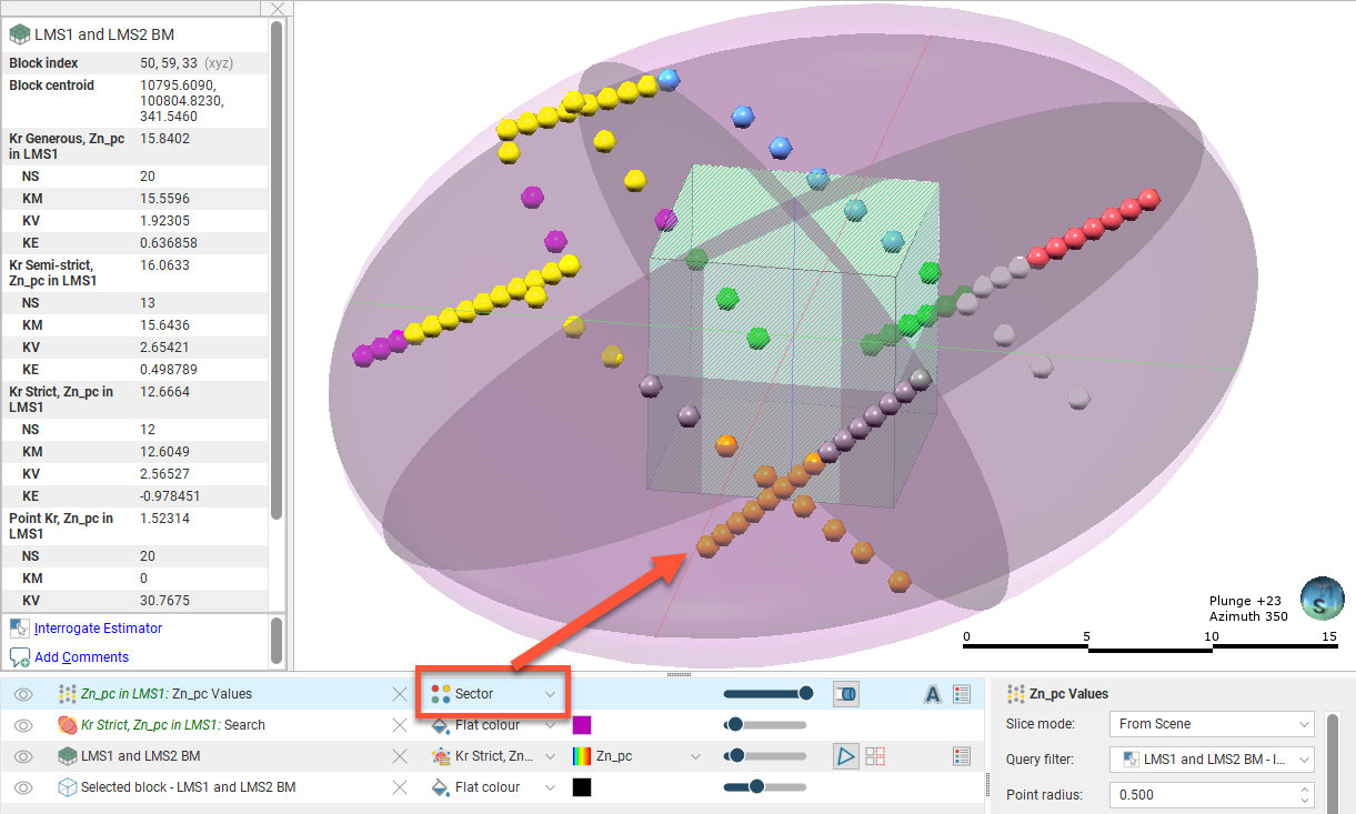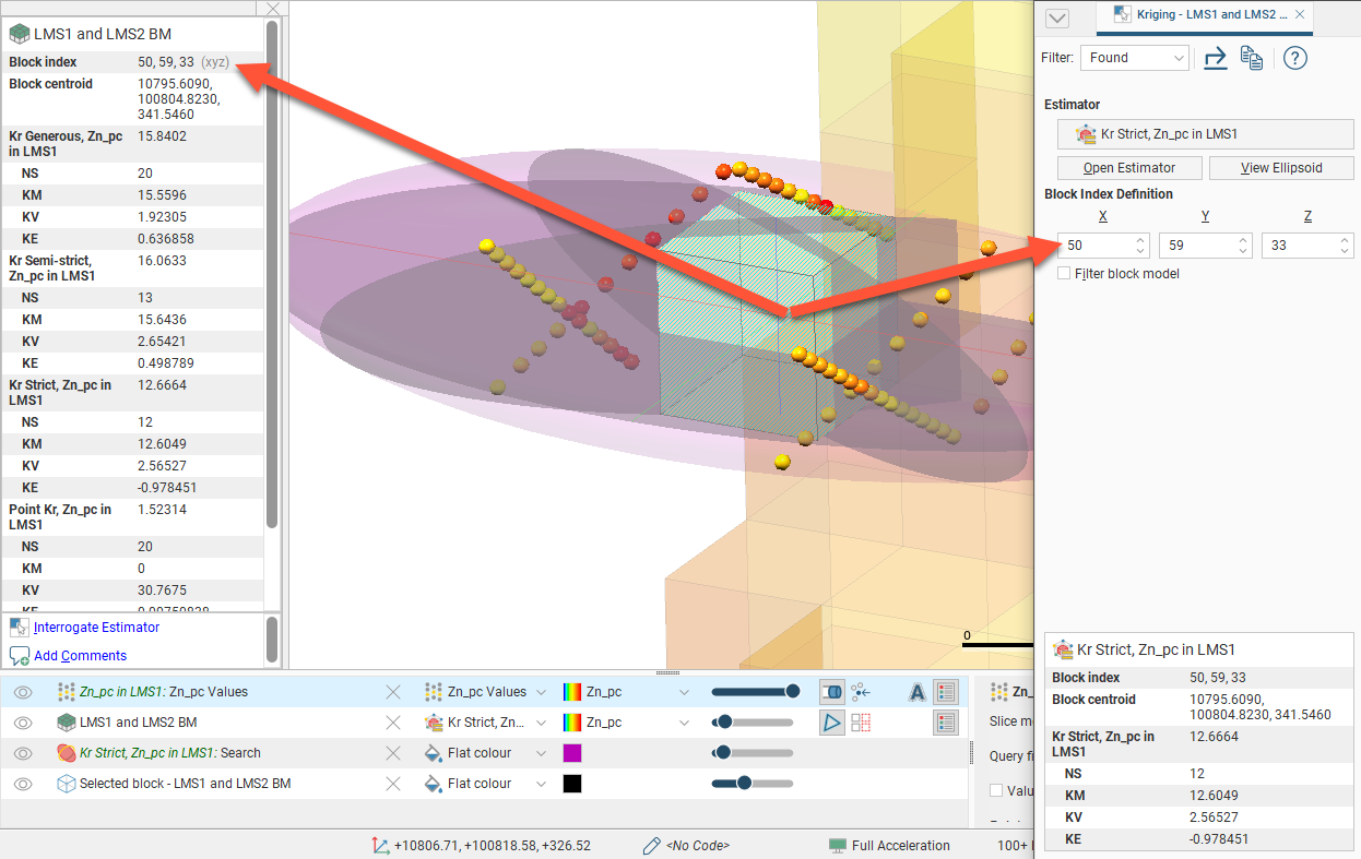 Enable Filter block model to see only the selected block in the scene, which will reduce the visual noise of all the other blocks. This will help you see the associated data points and the search ellipsoid in relation to the selected block: