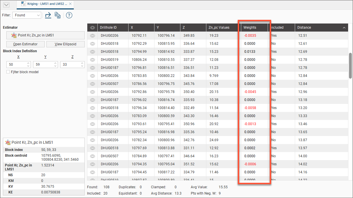 ) to see all the Found data points in the block estimate interrogator table, or only the data points Included in the estimate, or only the data points that are Clamped. The Clamped option will only be present if Outlier Restrictions are being used by the estimator.