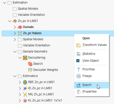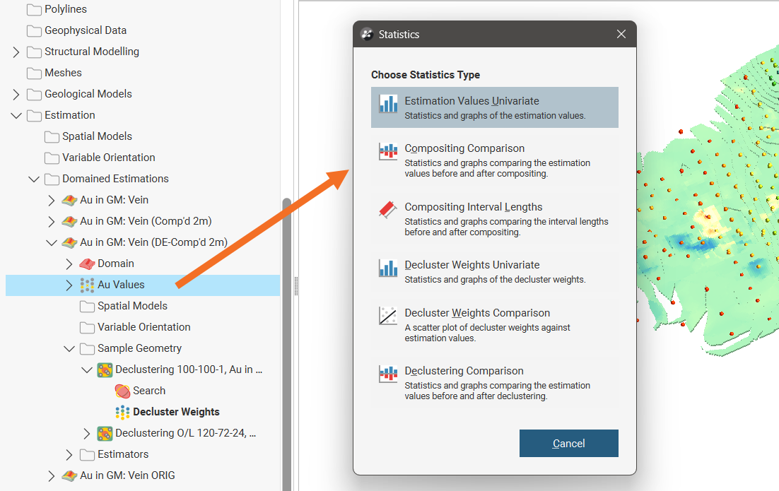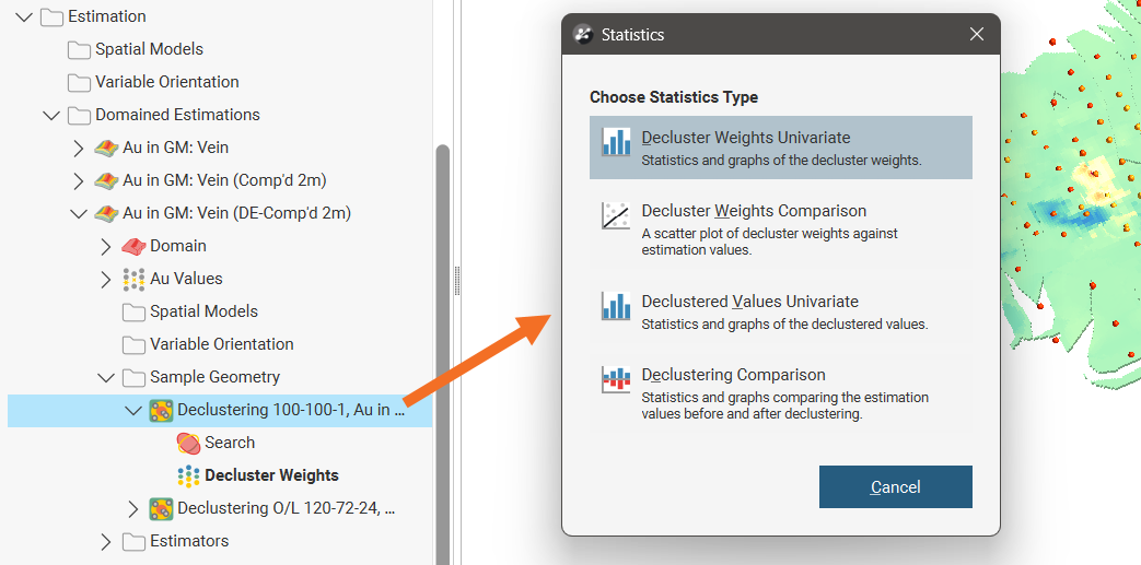 Another way to access the declustering statistics options is to right-click on a declustering object in a domained estimation and select Statistics. Then you can choose from a list of available statistics, all of which are declustering statistics. There is an additional option in this selection dialog, Decluster Values Univariate.