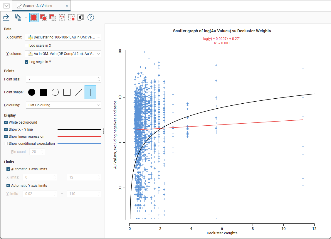 This is a scatter plot that uses a decluster weights selection for the X axis plotted against the input values on the Y axis. You can make either axis a log scale with the Log scale in X and Log scale in Y options.