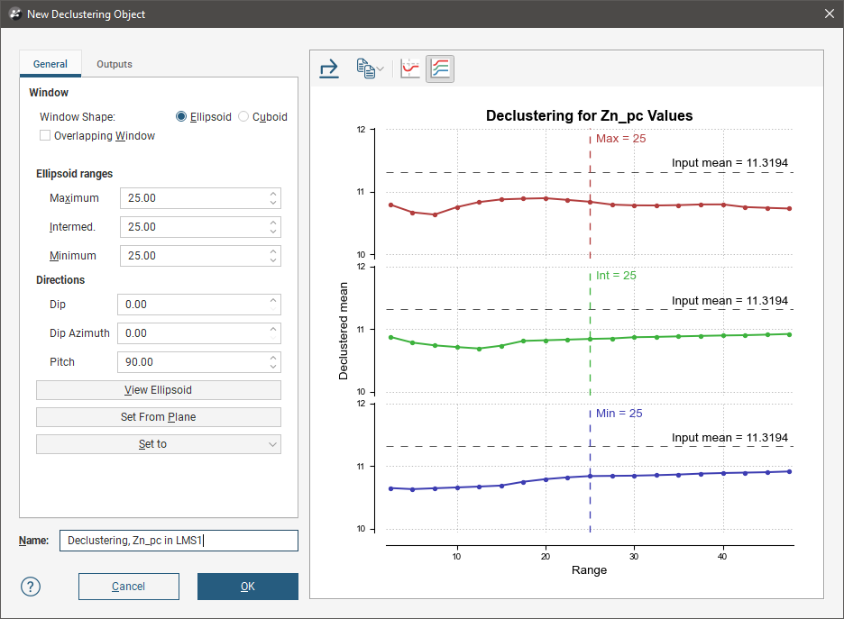 The Ellipsoid Ranges settings provide the same anisotropy controls used elsewhere in Leapfrog Energy, determining the relative shape and strength of the ellipsoid in the scene. Including them here provides additional advantages over traditional grid declustering.
