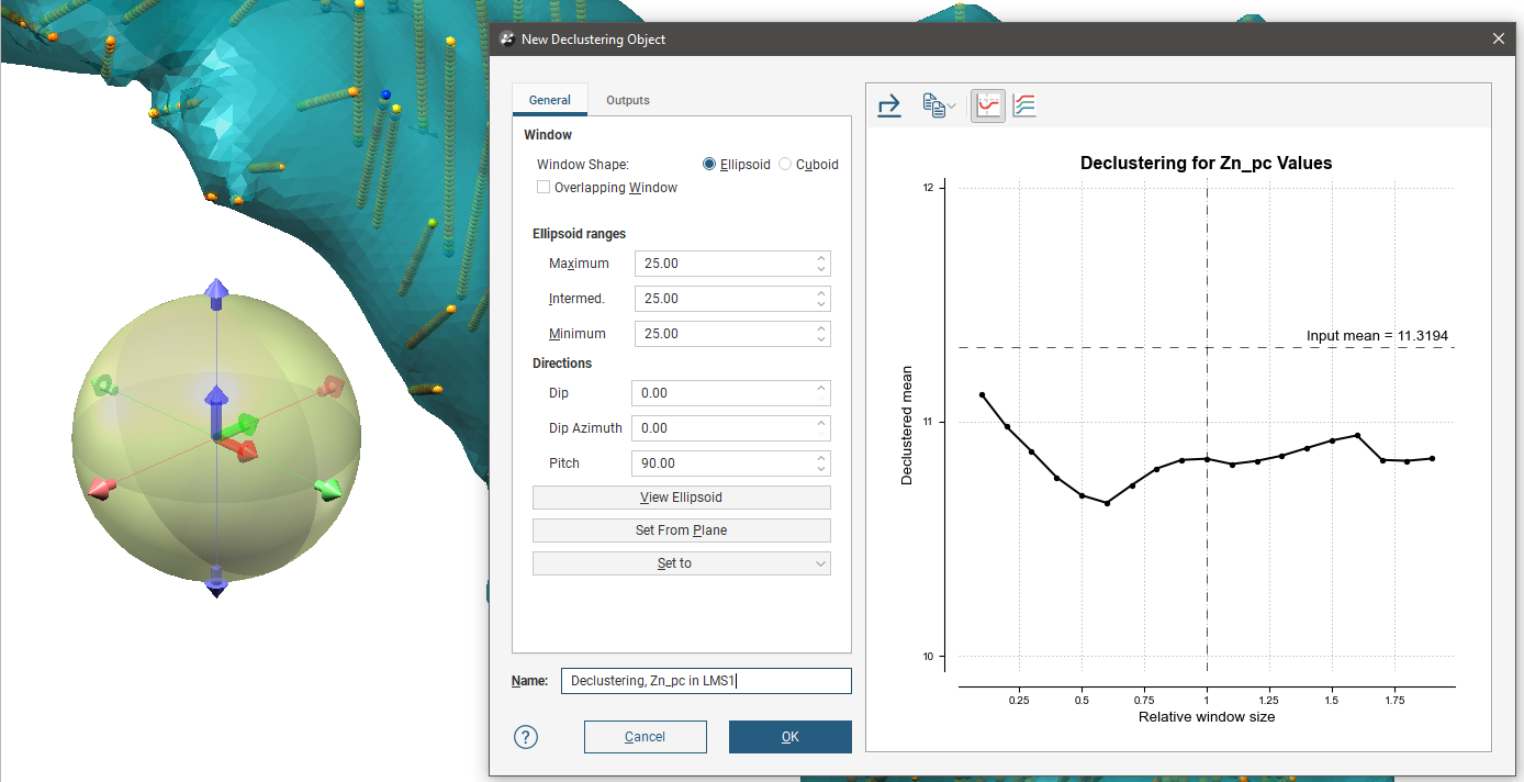 To create a new declustering object, right-click on the Sample Geometry folder for a domained estimation and select New Declustering Object. The New Declustering Object window will appear and an ellipsoid will be added to the scene.