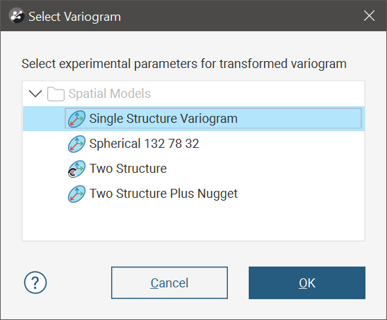 If multiple variogram models exist in the domain, a dialog will appear asking you to select which variogram model to use to obtain the experimental parameters for the new transform variogram model:
