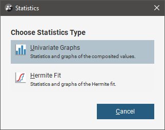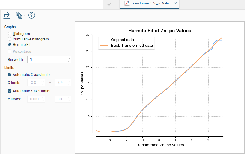 The standard Univariate Graphs option provides a histogram and other related plots of the transformed data. An option specific to transformed values, the Hermite Fit graph, has been added to show the fit of the Hermite polynomial to the cumulative distribution of the raw data.