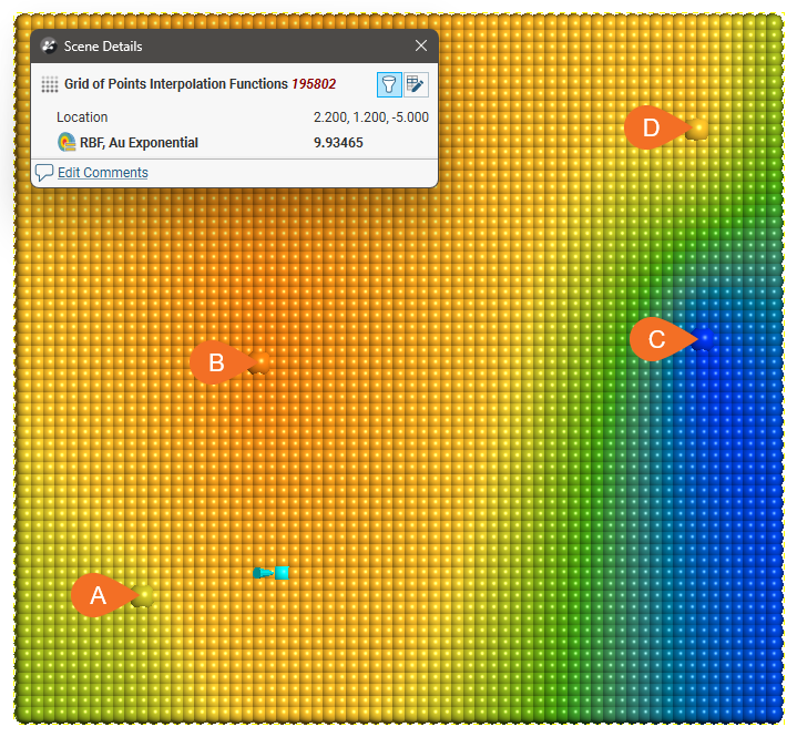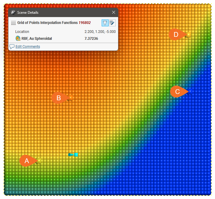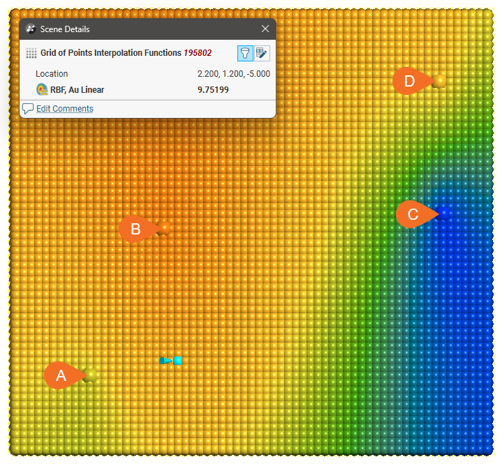 For each model type, the effect of the interpolation function is depicted by evaluation onto a grid of points, using as input just four samples, A = 7, B = 14, C = 2 and D = 8. A thin slice is taken through the grid of points to provide a sort of 2D visualisation of the operation of the function. One of the points has been selected in each view to display the value being estimated for a specific location.