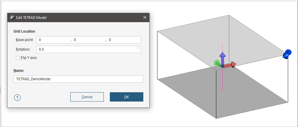 Next, the Edit TETRAD Model window will be displayed. If the model is in the wrong location, you can adjust its location using the controls in this window and in the scene: