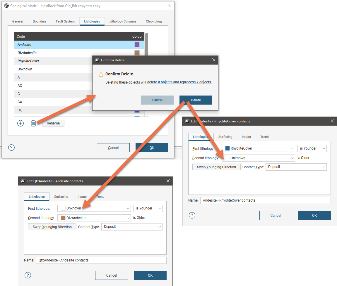- Make a test copy of the geological model and work in that copy before committing to changing the base lithology column in the model that is linked to other objects in the project. This will help you determine what changes to lithology codes and contact surfaces need to be made without affecting and/or reprocessing other objects in the project that are dependent on the geological model.