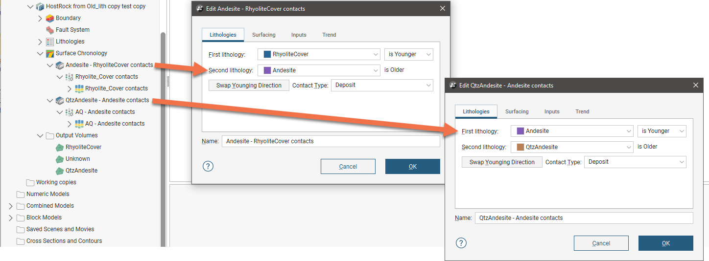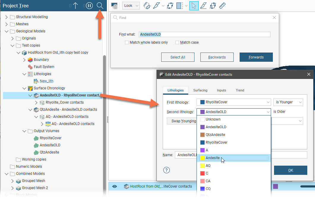 Once the base lithology column has been changed, we can then search for the renamed code in the project tree and switch the lithology used by contact surfaces to the code in the new base lithology column: