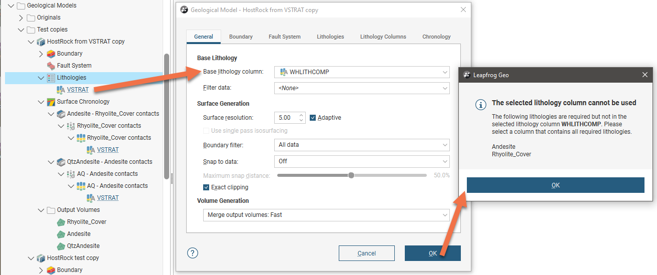 Note that when you make a test copy of the geological model to experiment with the effects of changing the base lithology column, this will only tell you what the effects are in the model itself. Only the original geological model is linked to dependent objects in the project; copies are not linked.