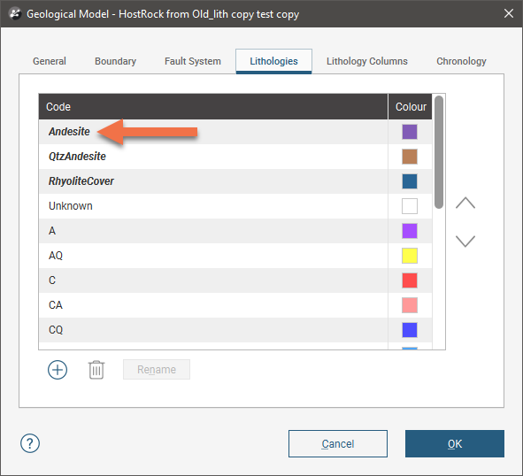 Looking at the geological model’s lithologies, we can see that it contains the manually defined code Andesite, which will conflict with the Andesite code in the New_lith column: