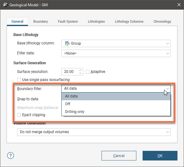 To change the default boundary filtering option for a geological model as a whole, double-click on the model in the project tree. The default Boundary filter setting is in the General tab: