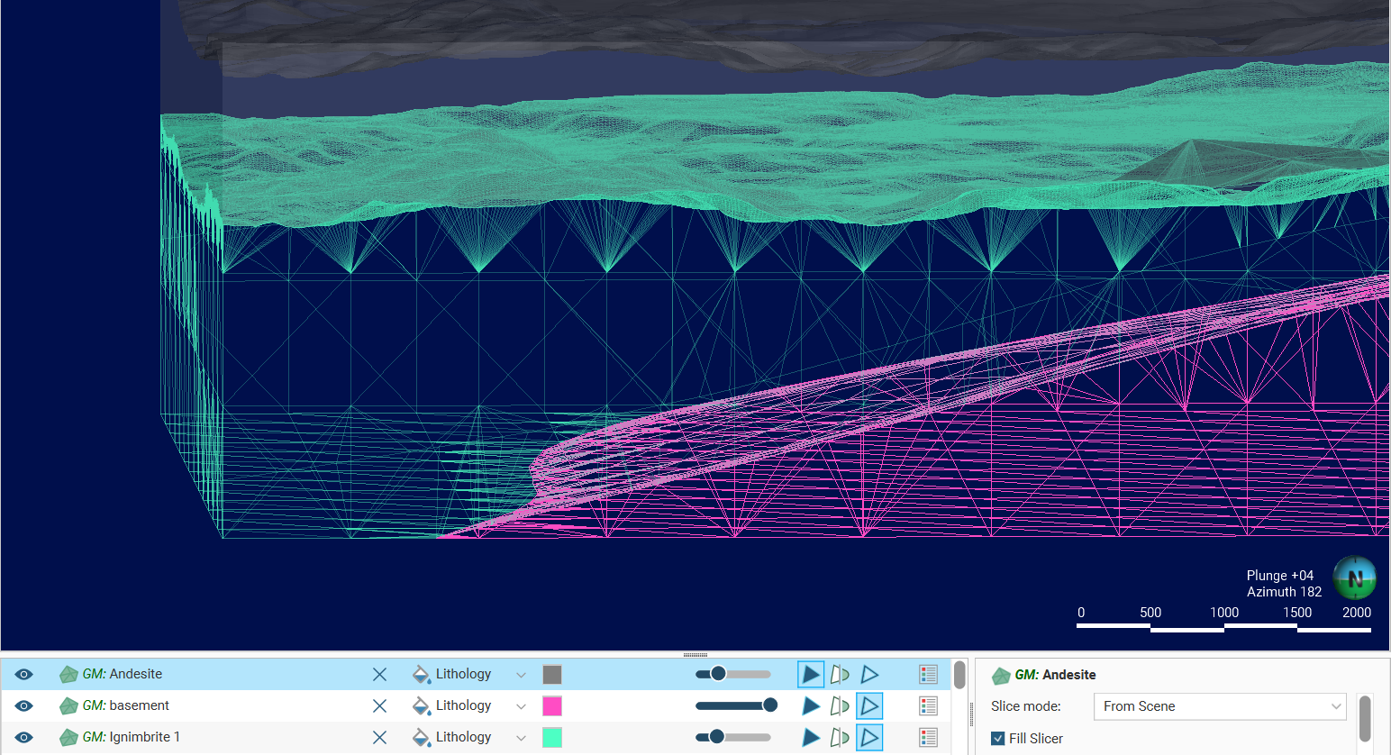 The lithology column used as the base lithology column is displayed in the scene, along with its legend. Note that the model’s Lithologies tab shows the same lithologies as the base lithology column, along with the lithology “Unknown”.