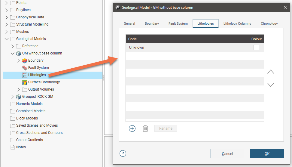 When you create a geological model without assigning a Base lithology column, the only code in the Lithologies list will be Unknown: