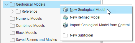 To create a new geological model, right-click on the Geological Models folder and select New Geological Model: