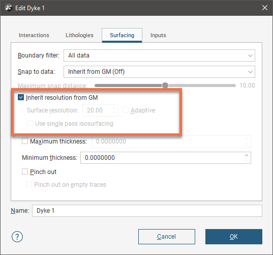 When surfaces and boundaries are created as part of the model-building process, their resolution is inherited from the geological model:
