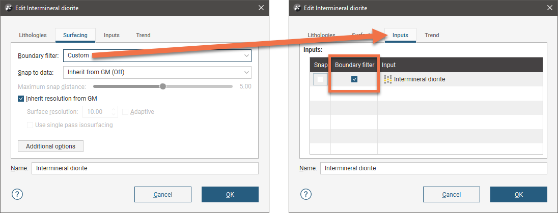 By default, geological models are created with boundary filtering on for all data used to build the model. This default value can be changed once the model has been created and later, as you build model surfaces, you can also set boundary filtering on a surface-by-surface basis.