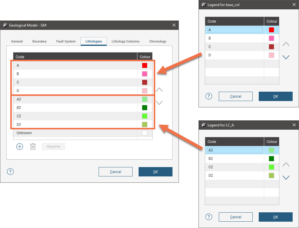 You cannot rename codes derived from the base lithology column or from linked lithology columns, but you can rename manually defined codes. When you rename a code that is used in surfaces built for the geological model, the name will be updated where that code is used.