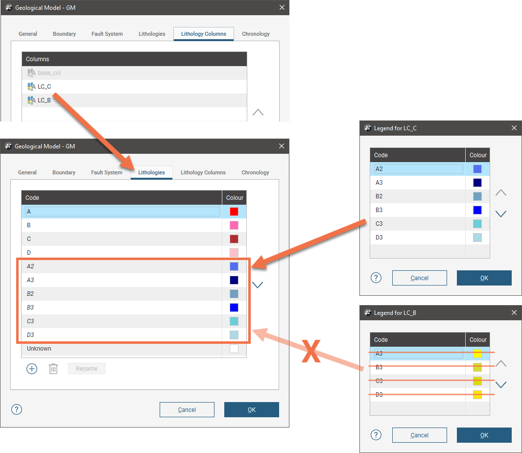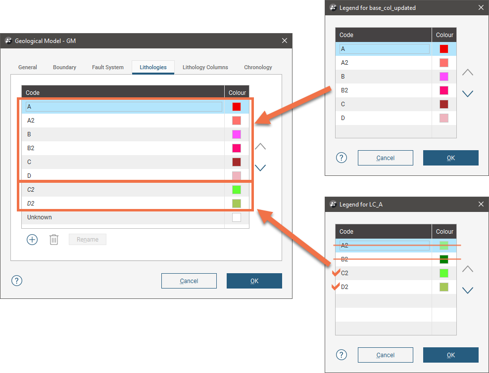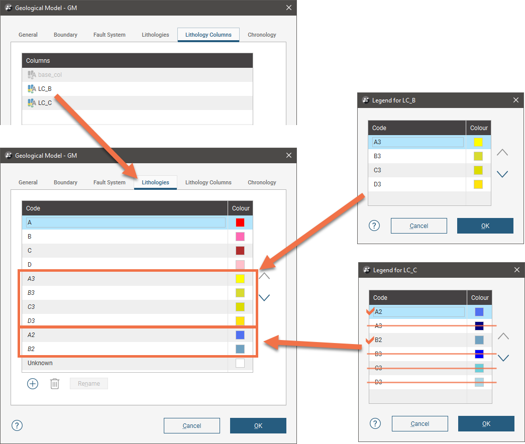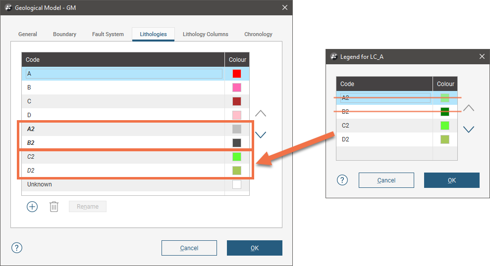When column LC_A is linked, two of its lithology codes (C2 and D2) are added to the geological model’s lithology codes, but A2 and B2 are not, because the manually-defined codes are of higher priority: