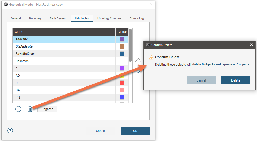 Click on the link to see what objects are affected by the change and decide how to manage those changes before clicking Delete, then OK in the Geological Model window.