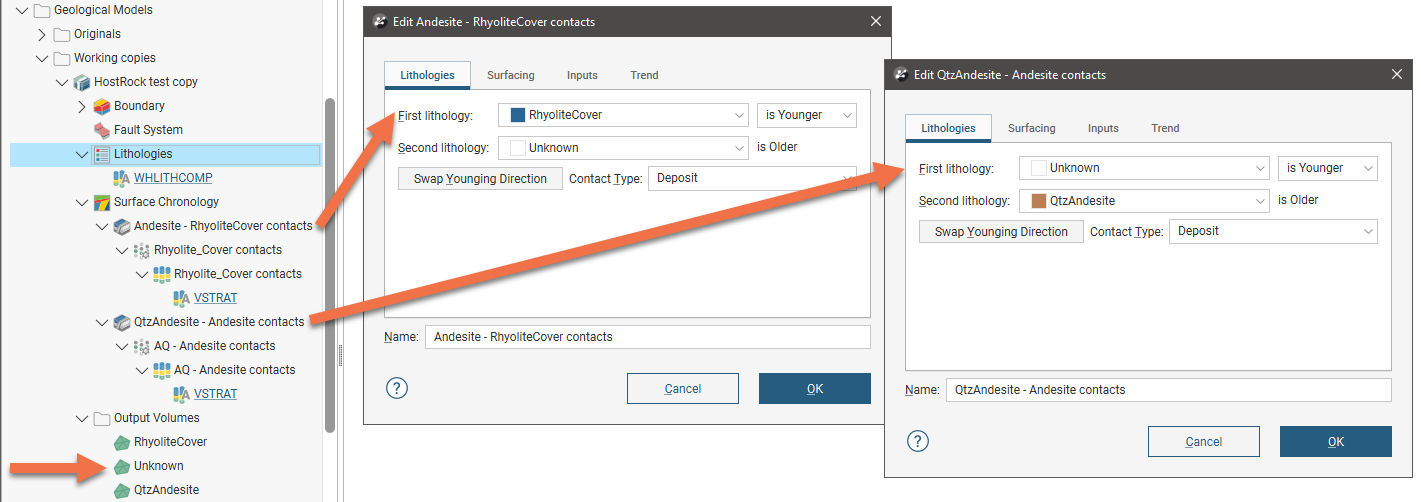 Deleting the Andesite code from the Lithologies tab will result in the code being replaced by the code set as the Background lithology (in the Surface Chronology tab). In this case, the background lithology is Unknown, which is substituted for the deleted code in the contact surface windows: