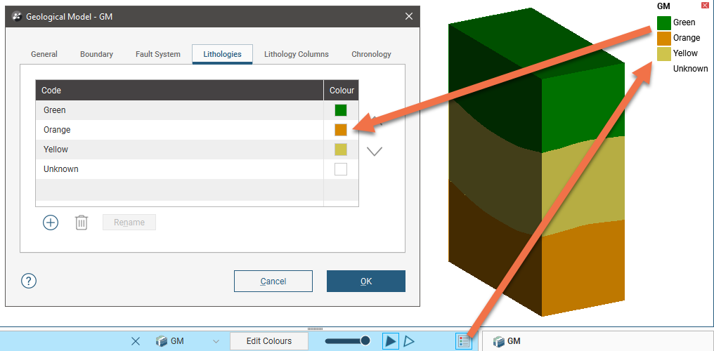 - Derived from the base lithology column. If a model is created from lithology data, the codes used in the model are derived from that lithology data; changes to that data will be updated in the geological model, and vice versa. For example, if you edit the colour for the lithologies in the source data, those colours will be updated in the geological model, and editing the colours in the geological model will update the colours used in the source data.