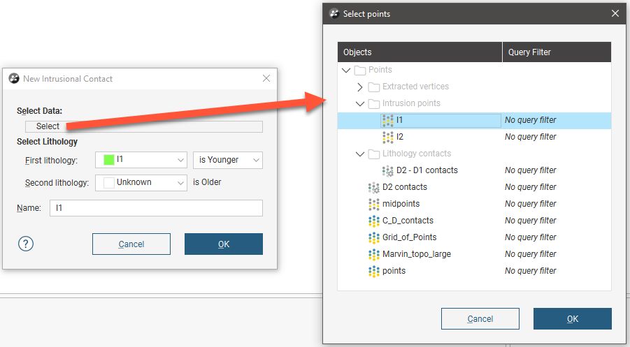 Lithology data is often the most reliable data source to use when building geological surfaces, and it is best to derive contact surfaces from lithology data when it is available. There are two ways to create intrusions from lithology data: