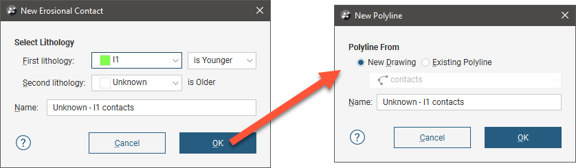 For polylines, you first set the lithologies and the younging order, then click OK to move on to the next step: