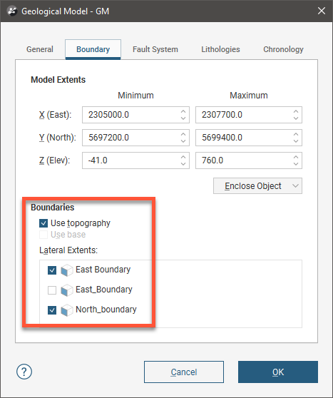 The second method is useful if you are making changes to the extent and do not want to recompute the model with each change. Double-click on the model’s Boundary object or double-click on the model and click on the Boundary tab. The Boundaries part of the window lists all objects used as extents for a geological model: