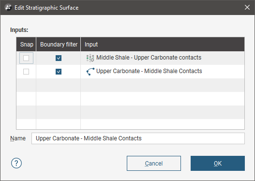 All contact surfaces that make up a stratigraphic sequence will inherit the Boundary filter setting from the stratigraphy unless Boundary filter is set to Custom.