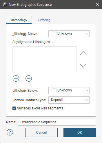 To create a stratigraphic sequence, right-click on the Surface Chronology object and select New Stratigraphy. The New Stratigraphic Sequence window will appear: