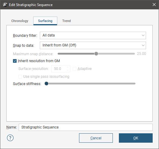 There are general boundary filtering and snap settings for the stratigraphic sequence as a whole, but it is possible to override these settings for the individual surfaces that are part of the stratigraphic sequence. To do this, first double-click on the stratigraphic sequence itself, then click on the Surfacing tab.