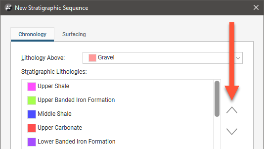 Select the lithologies that you want to use in the stratigraphic sequence, then click OK to add the layers to the Stratigraphic Lithologies list. Make sure they arranged in the correct order, using the arrows alongside the window to rearrange them, if necessary: