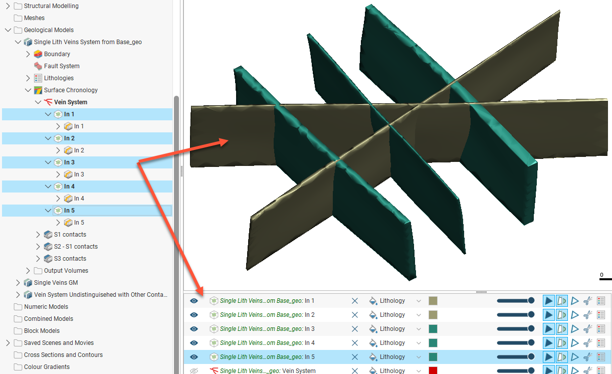 This does not restrict or limit the model to a single lithology representation. Each of the veins can be coded for different lithologies. As a result, the model could be used to depict two different geological processes responsible for the vein formation: