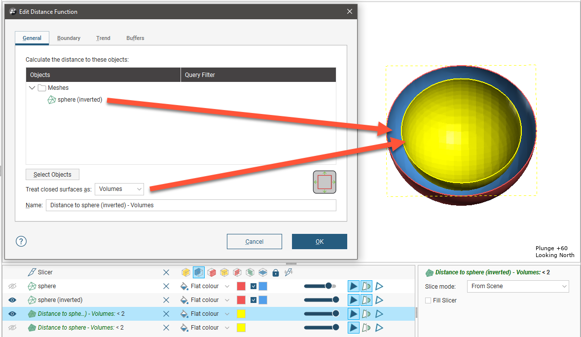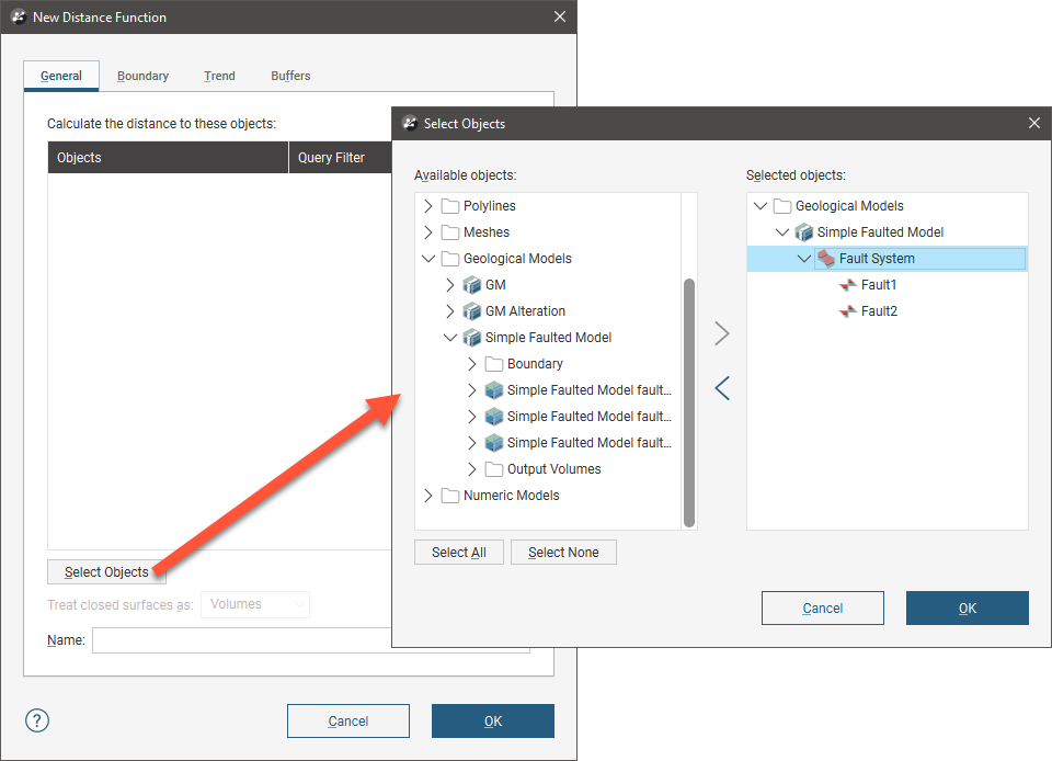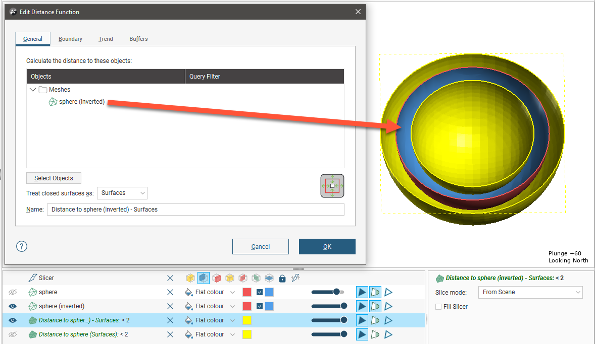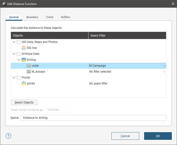 If you are unsure of some settings, most can be changed later. For a basic distance function click Select Objects to select from the suitable objects available in the project, then click on the Buffers tab to define at least one buffer so that the distance function can be visualised in the scene.