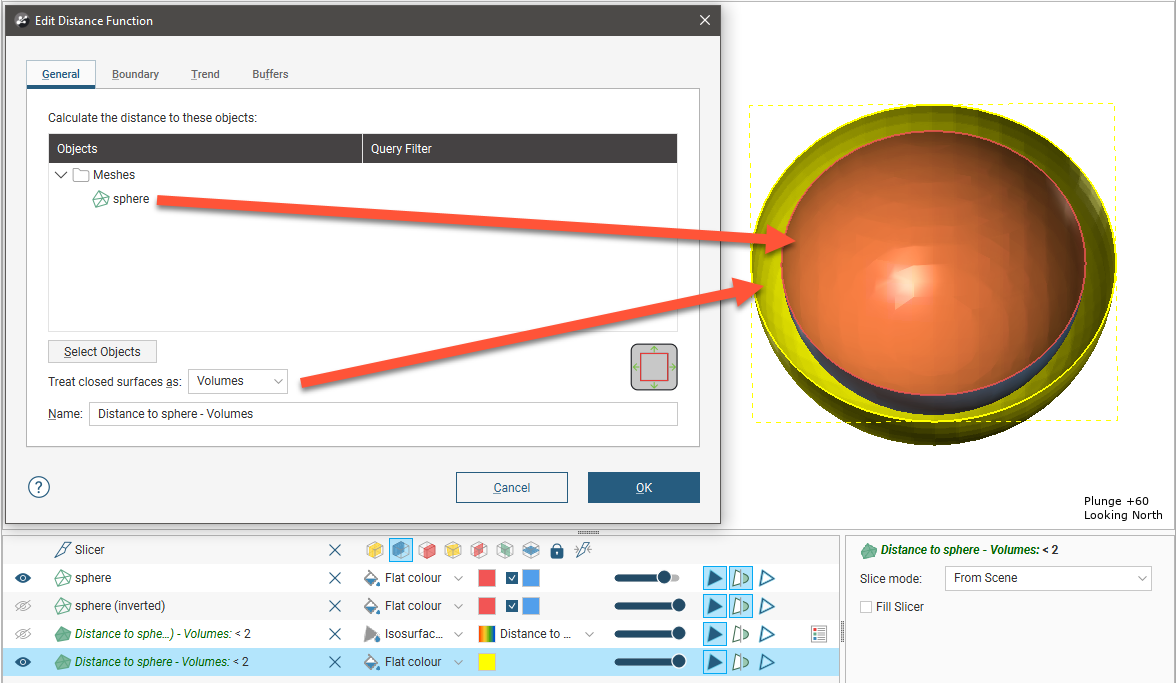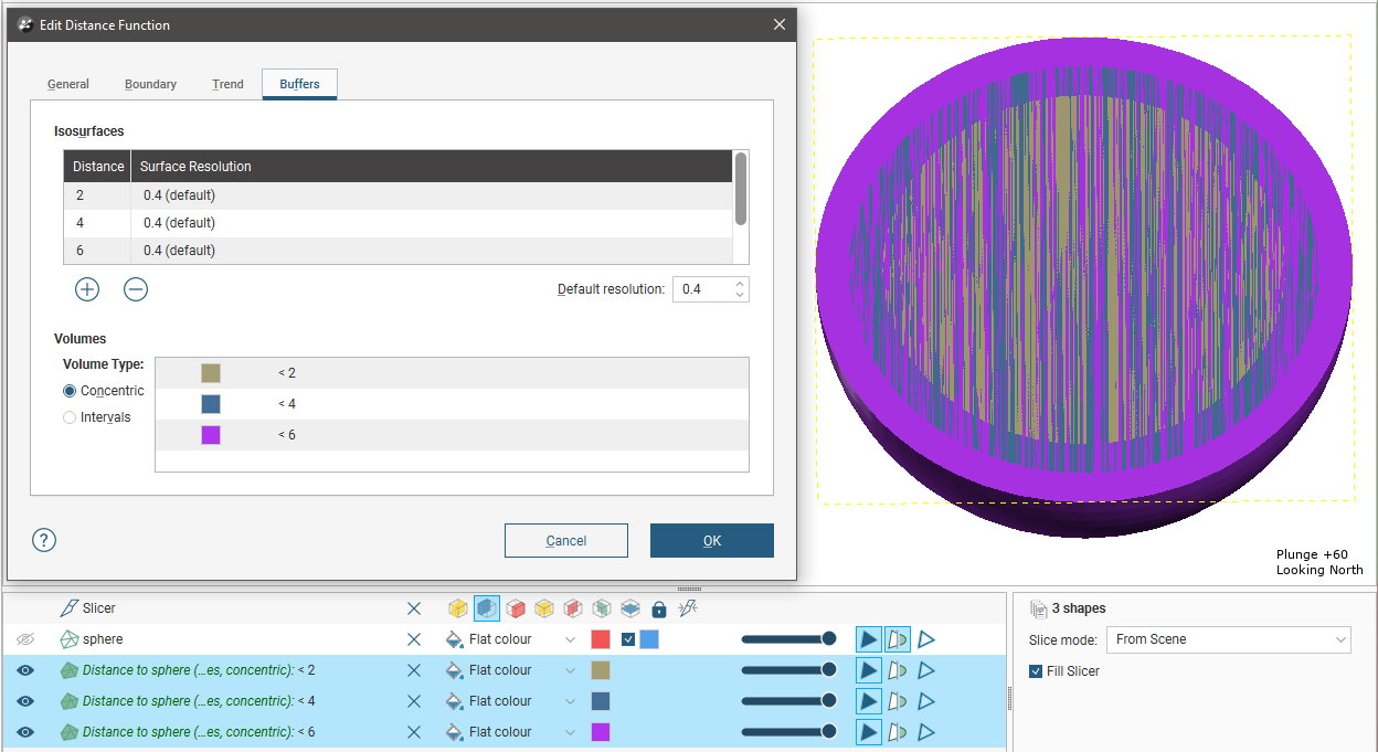 In the examples that follow, a distance function is created from a sphere and a single isosurface is defined in the Buffers tab, with its distance set to 2: