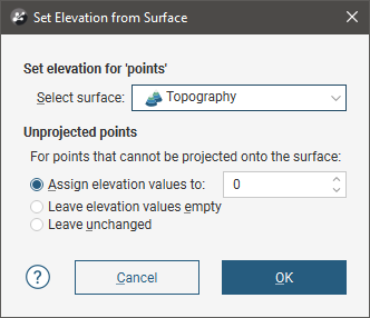You can set the elevation for points tables by projecting them onto a surface. This overwrites elevation values in the z column of the points table, using the data from the selected surface. If the surface does not intersect vertically with all points, you can choose how the z values for those unprojected points will be handled.