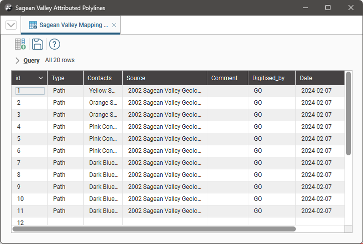 Assigning attributes to polylines adds a new column to the polyline table. In this example, a number of attributes have been added to a table; each appears as a column: