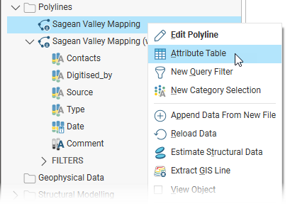 In Leapfrog Energy, polylines saved in the Polylines folder have an attribute table that can be opened by right-clicking on the polyline in the project tree and selecting Attribute Table: