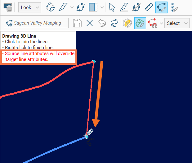 Similarly, if you move a polyline node to link it to another line, the first polyline will be the source line for any attributes to be applied to the resulting polyline.