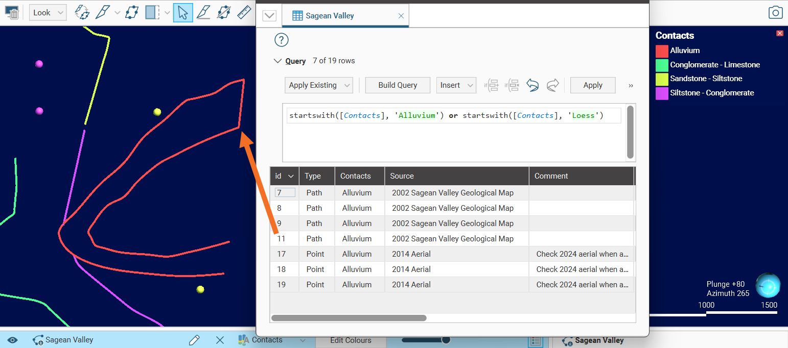 This results in the two lines being joined together into a single line, and the Contact category Alluvium is assigned to this line.