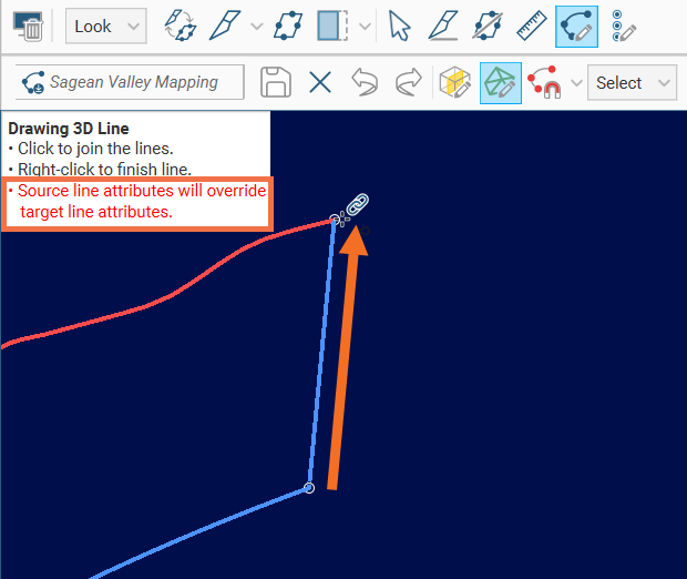 When editing polylines with attributes, you may wish to join two segments that have different attributes. If this is the case, the resulting single polyline can only have one of the original attributes. By convention, the line that you start drawing from when connecting one line to another is regarded as the source line, and its attributes will be preserved.