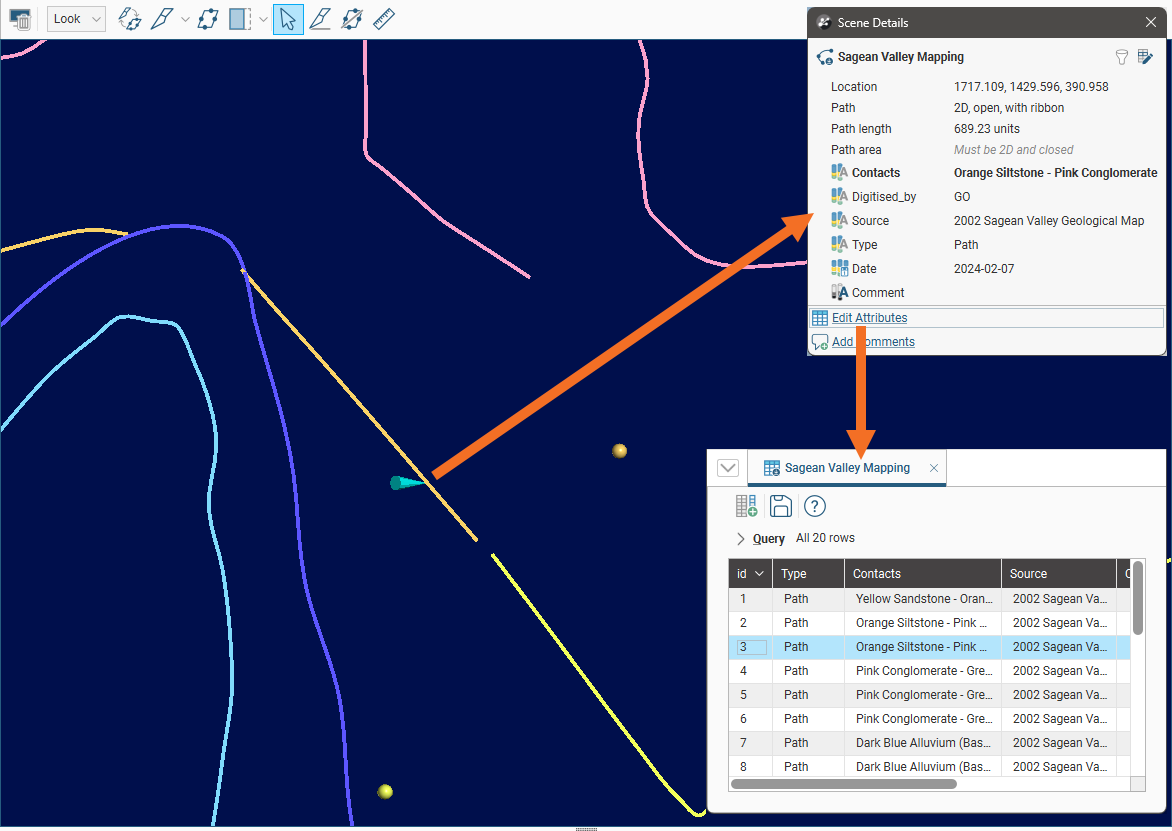 When a polyline is displayed in the scene and you wish to add an attribute, click on the polyline in the scene and select Edit Attributes from the Scene Details panel. This will open the attribute table and highlight the selected polyline part.