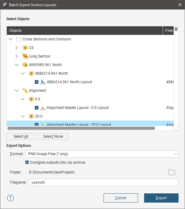 You can also batch export multiple section layouts. To do this, right-click on the Sections, Plans and Contours folder and select Batch Export Layouts. All selected sections can be exported as a single PDF or individually in PDF file (*.pdf), Scalable Vector Graphics file (*.svg), PNG image (*.png) or GeoTIFF (*.tiff, *.tif) formats. When section layouts are exported individually, all outputs can be combined into a zip archive.