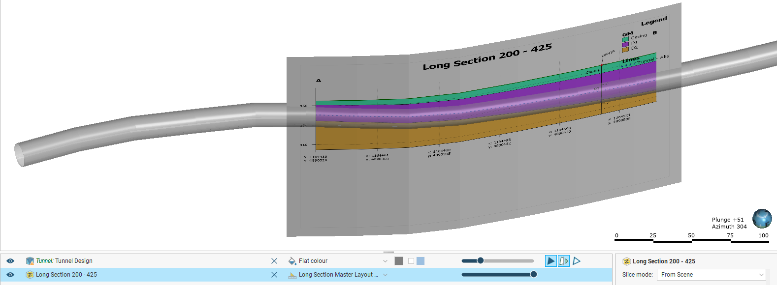- Illustrative. Wells will be projected onto long sections using a projection that proportionally scales the projection angle into section panel bends, giving all wells a natural contiguous appearance on the section. This projection cannot be used for obtaining accurate distance measurements using the section drawing, but it can be useful for communicating the underground model to non-technical audiences.