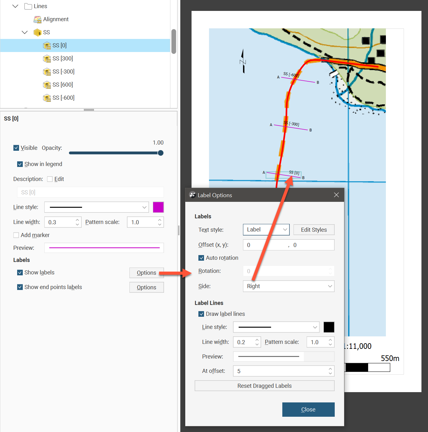 Along with other line colour, style and width controls, section lines can have their labels positioned to the Left, Centre or Right by clicking through to the labels options.