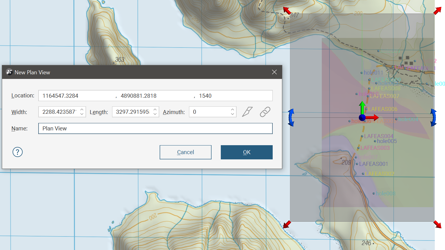 If there is no existing plan view, first add a model to the scene and press the D key to get a top-down view of the model. Next, right-click on the Sections, Plans and Contours folder and select New Plan View. The New Plan View window will appear, together with a plan view plane and controls in the scene that let you adjust the position of the plan view plane: