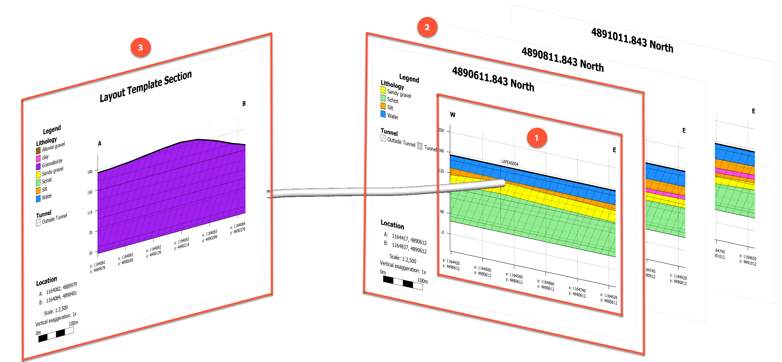 A section (1) is presented on a section layout (2) that arranges the section alongside other information such as the section title, legend and location reference. To make multiple section layouts consistent and to reduce the work involved in creating them, a layout template (3) can be created to define the overall layout structure that will be replicated on each section layout.