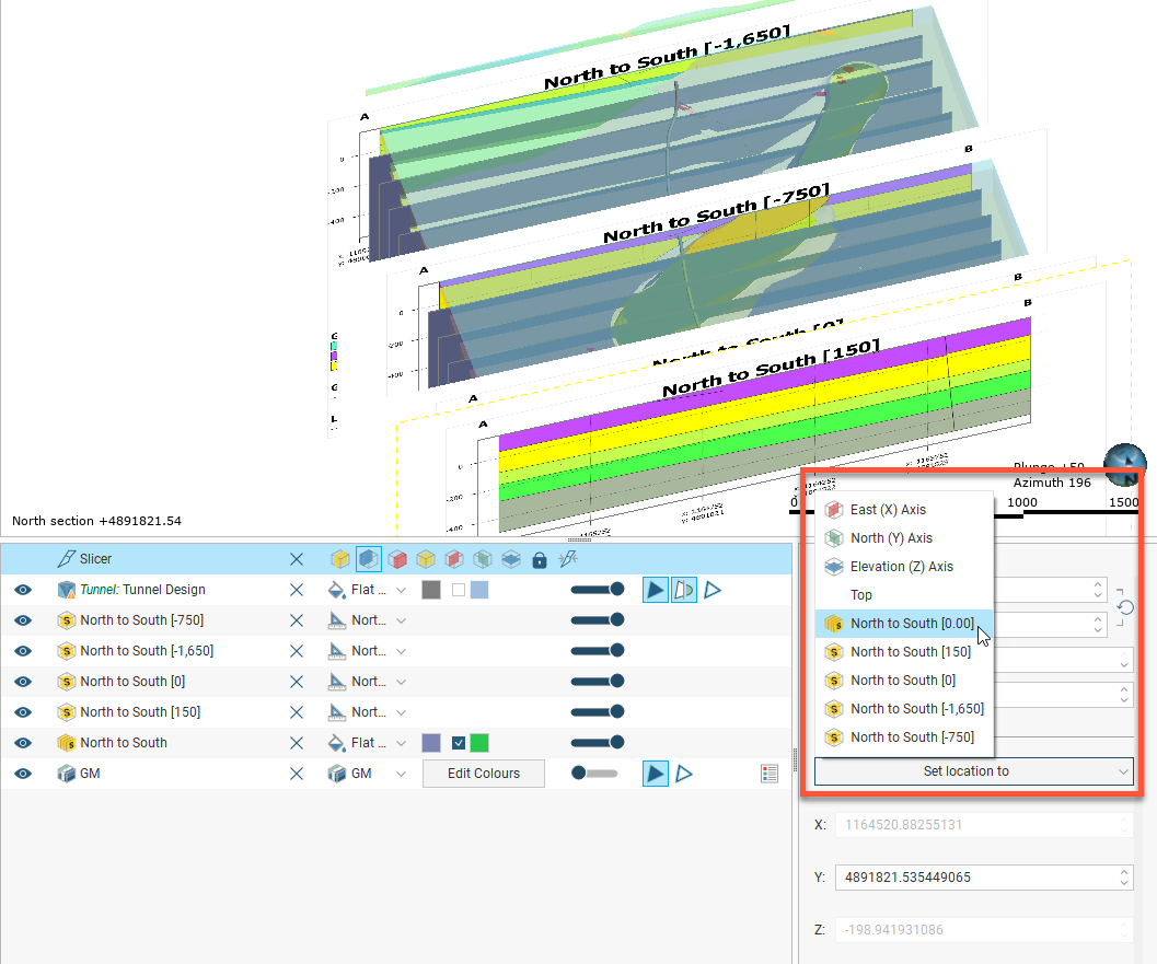 When you display a serial section in the scene, you can add the slicer to the scene and use it to move easily between the sections in the stack. To do this, click on the slicer in the shape list, then select the base section from the Set location to list: