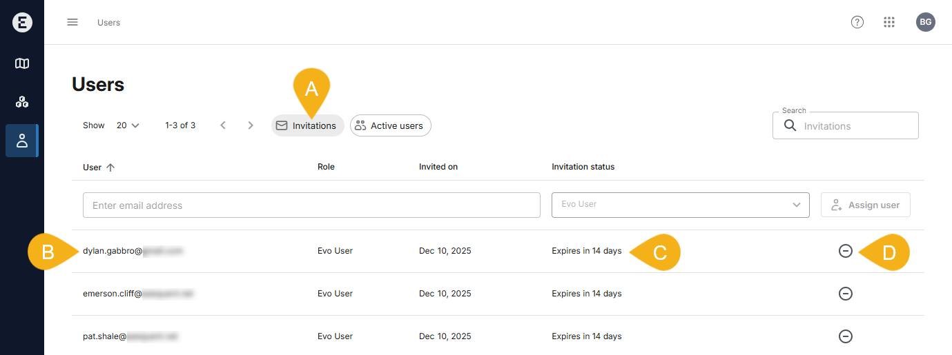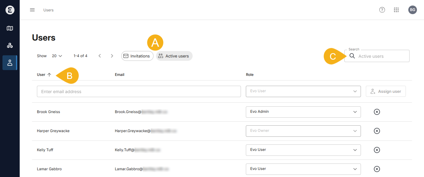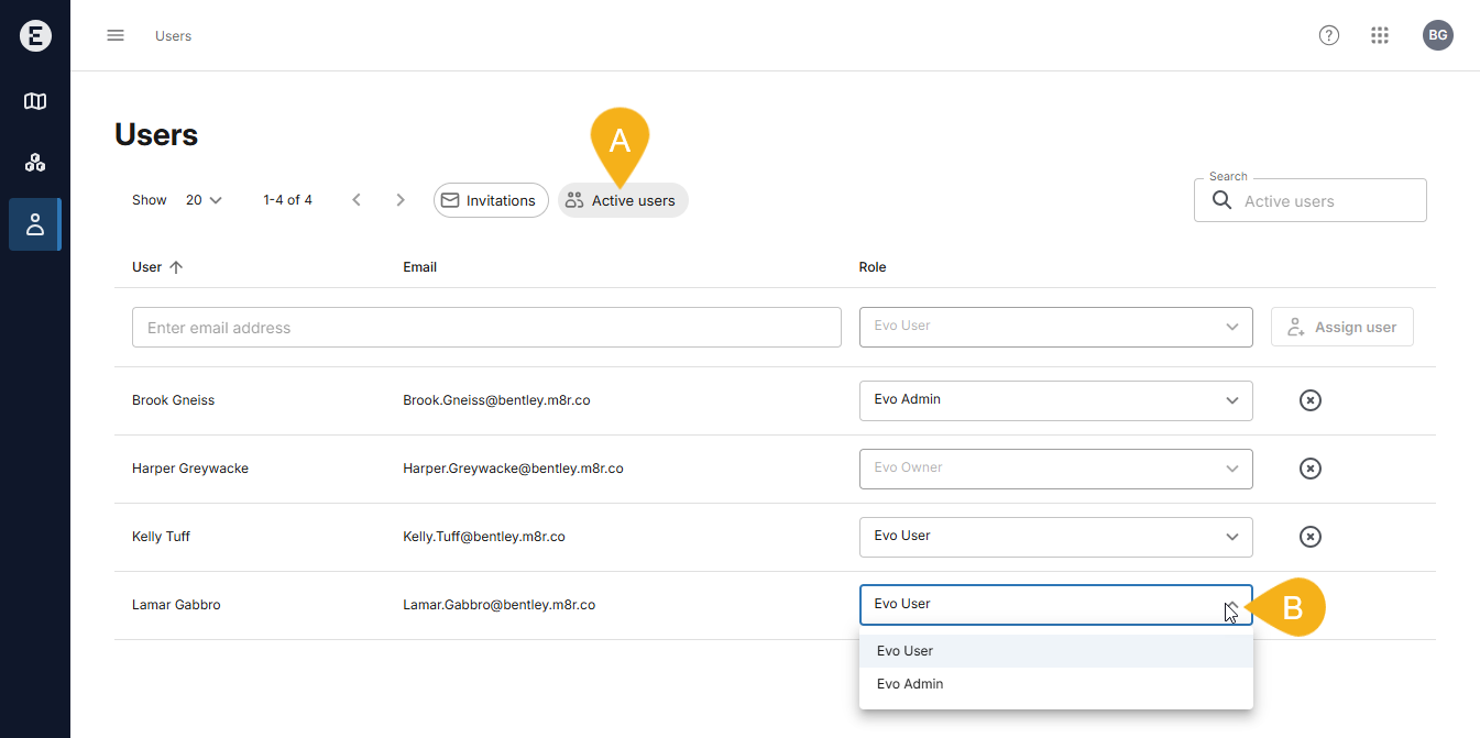 To add new users to an Evo instance, click on Users in the sidebar to display the Active users list (A).